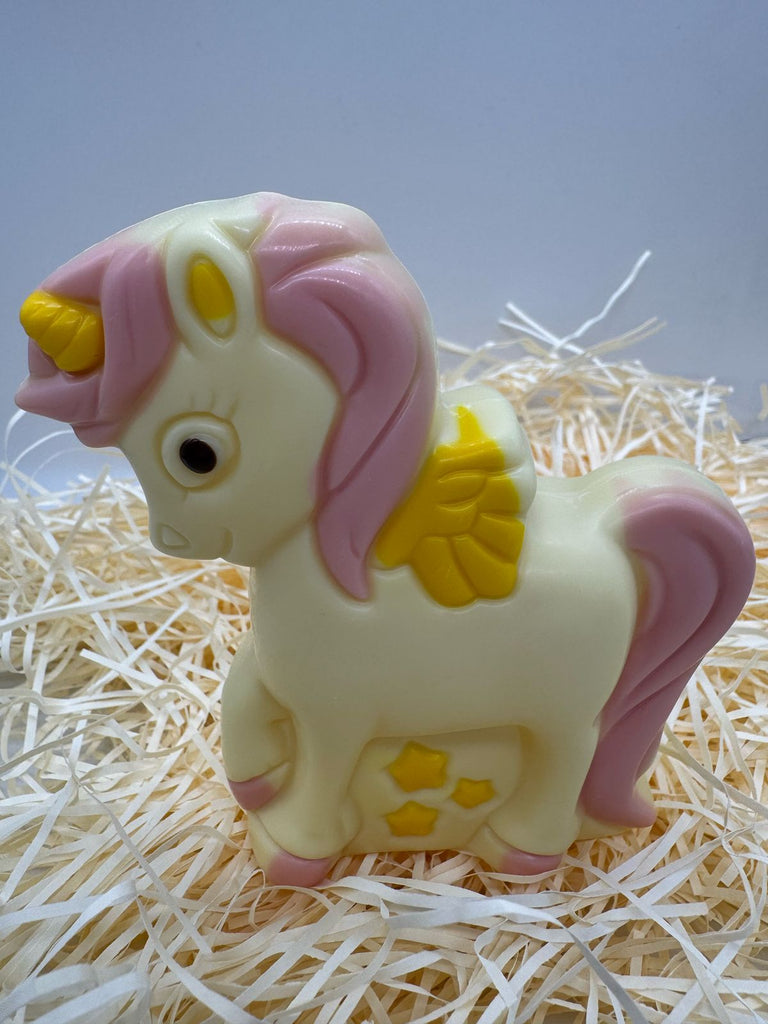 Make every celebration magical with Helen’s Chocolate Unicorn Hollow – a whimsical treat made from smooth, creamy white chocolate. This charming unicorn features a pastel pink mane, yellow wings and stars, and a golden horn, making it a delightful feast for the eyes and the taste buds.